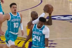 詹姆斯快攻合球撞倒米勒 裁判吹罚防守犯规 黄蜂教练挑战失败