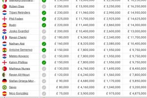 曼城球员薪资:哈兰德居首,塞梅尼奥15万镑第13,多库5万镑第23