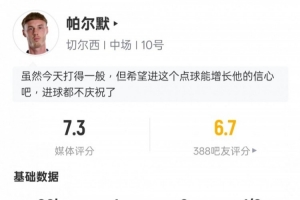 帕尔默本场比赛数据:1点射2过人成功2次拦截,评分7.3