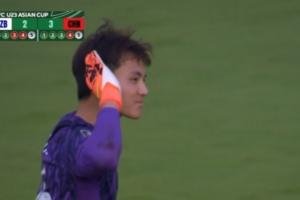 点球大战李昊扑出对手的一粒点球,李昊扑点后张开双臂满脸写着无敌,挥手示意呐喊声大点。