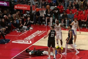 冲劲十足!詹姆斯强攻造成夏普犯规 开拓者挑战也失败了