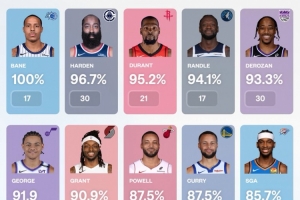 关键时刻罚球命中率:贝恩100%领跑 哈登96.7%第2 库里87.5%第9