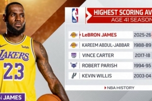 41岁球员场均分对比:詹姆斯22.6分 天勾10.1分 文斯·卡特5.4分