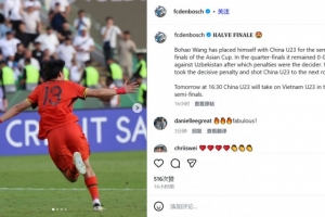 体育资讯1月20日讯 荷乙球队邓伯什更新官方ins,祝贺王博豪闯入U23亚洲杯四强。