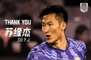 津门虎官方写道:121次出场,4粒进球,9次助攻。感谢苏缘杰对天津足球的付出与贡献!祝愿“大康”的职业生涯一帆风顺!