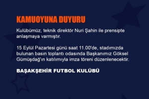 伊斯坦布尔俱乐部已与主教练沙欣原则上达成协议。双方签约仪式将于当地时间9月15日(星期一)上午11点在俱乐部体育场新闻发布厅举行,俱乐部主席戈克塞尔-古姆什达格将出席签约仪式。