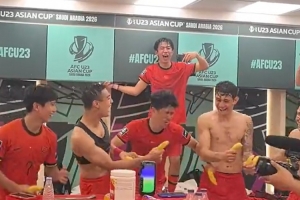 上一场淘汰乌兹别克斯坦后,U23国足球员手拿香蕉,跳起了时下流行的刀马舞。