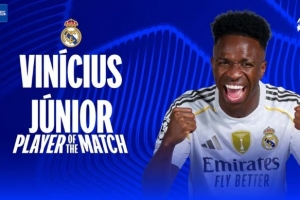 1进球7关键传球,维尼修斯当选皇马6-1摩纳哥一役全场最佳
