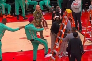 笑死了!索汉跃跃欲试要爬梯子上去修篮筐 比永博将他拉回来了