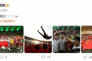 体育资讯1月21日讯 胡荷韬更新社媒,庆祝中国U23队进入U23亚洲杯决赛。