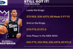 威少篮板&助攻&三分皆队内第一 650分&250板&250助&60断联盟唯一