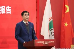 1月20日,中国足球协会主席宋凯在大会上作2025年中国足协工作报告。新华社记者 胡星宇 摄