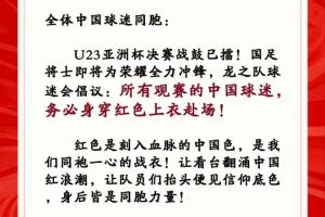 体育资讯01月23日讯 龙之队球迷会发布倡议书,呼吁球迷在明日的U23亚洲杯中日决赛现场身穿红色上衣赴场观赛,具体倡议如下。