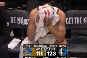 勇士垃圾时间 库里在替补席用毛巾捂脑袋 眼神无奈