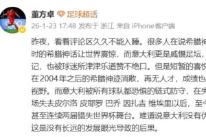 董方卓:昨夜,看着评论区久久不能入睡。很多人在说希腊神话和意大利链式防守,确实当时的希腊神话让世界震惊,而意大利更是威慑足坛,为世界足坛留下了深深的印记,也被球迷所津津乐道赞不绝口。