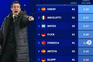 自2020年主帅欧战场均积分榜:埃梅里居首,安切洛蒂次席