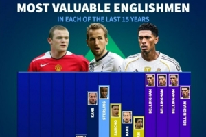 近15年每年身价最高英格兰球员:近5年均是贝林厄姆,凯恩在列