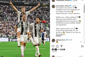 伊尔迪兹社媒晒出弗拉霍维奇背起他庆祝进球的照片,配文:“多么精彩的比赛,多么美妙的胜利!为我的队友们没有放弃感到骄傲,感谢球迷们的支持!”