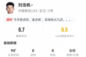 体育资讯1月25日讯 U23国足在U23亚洲杯决赛0-4完败于日本,左中卫刘浩帆本场数据如下: