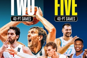 据Clutchpoints统计,1997年到2017年的10届欧锦赛,仅出现过两次40+,23岁的诺维茨基在2001年欧锦赛铜牌战中爆砍43分,35岁的保罗-加索尔在2015年欧锦赛半决赛中砍下40分。最近两届欧锦赛(2022和2025),已经出现5次40+,东契奇2022年对阵法国砍47分,今年对阵意大利砍42分,字母哥2022年对阵乌克兰砍下41分,马尔卡宁2022年对阵克罗地亚砍下43分,今年对阵英国砍43分。