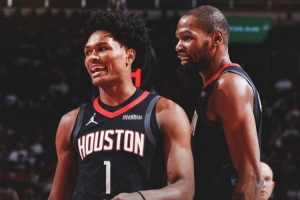 火箭官方晒赢球海报:送生涯新高14助攻的阿门登上封面 KD在列