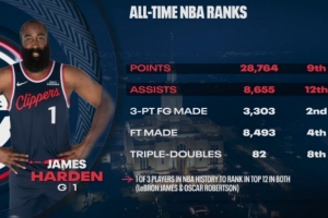 转播方晒哈登数据:得分、助攻、三分、罚球、三双都在历史前12