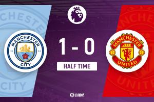 上半场补时1分钟,曼城1-0曼联。