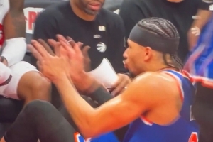 装大了!哈特投进三分后对着猛龙替补席突突突 被毛巾砸脸