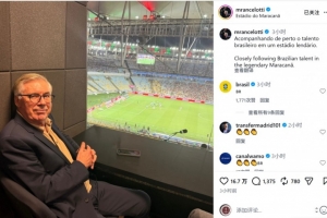 体育资讯1月30日讯 巴西国家队主帅安切洛蒂更新社媒动态,晒出在马拉卡纳球场观看比赛的照片。