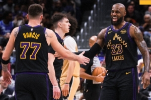 百分组合!湖人官方晒赢球海报:詹姆斯、东契奇击掌登上封面
