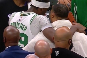 小插曲!布歇压哨扔进三分&威少不满差点冲突 双方解释后友好退场