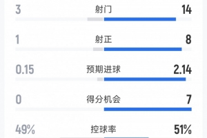 阿森纳4-0利兹联全场数据:射门14-3,射正8-1,得分机会7-0