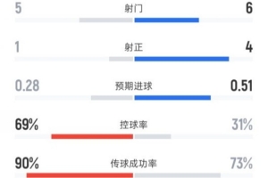 切尔西半场0-2西汉姆联数据:射门5-6,射正1-4,控球率69%-31%