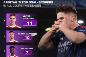阿森纳本赛季队内射手榜:约克雷斯11球领跑,马丁内利10球