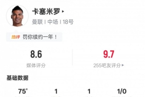 卡塞米罗本场数据:传射建功+1关键传球3解围3抢断,评分8.6