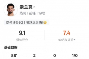 索兰克本场数据:双响+2过人成功1关键传球,评分9.1