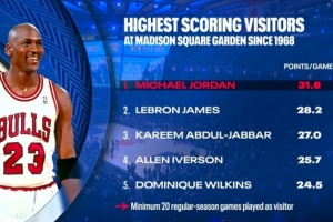 麦迪逊客场球员场均得分:乔丹31.8分高居榜首 詹姆斯28.2分第二