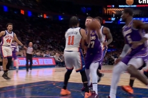 老队友!东契奇强攻布伦森造杀伤 尼克斯挑战成功改判进攻犯规