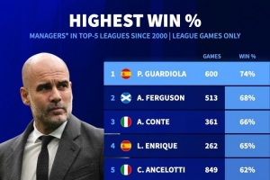 本世纪教练五大联赛胜率榜:瓜帅74%居首,弗格森、孔蒂二三位