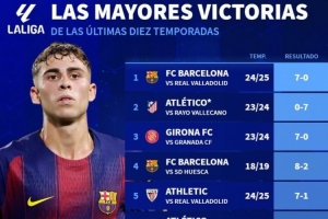 西甲最大比分赢球top10:巴萨5上榜,瓦伦西亚一年内两次成背景板