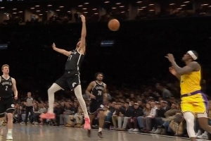 大师级传球!詹姆斯四分卫长传刚好越过防守人 范德彪舒服扣篮!