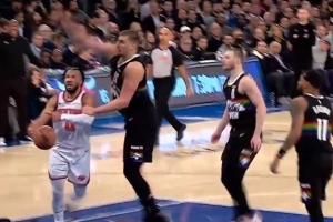 布伦森突破被约基奇连拉带拽放倒在地 裁判回看没有升级犯规