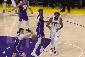 很坚决!双方拼抢出界给湖人球 76人挑战成功拿回球权