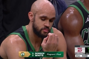 德里克·怀特扑防鲍威尔三分犯规疑似垫脚 裁判回看升级一级恶意