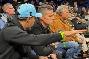 体育资讯2月7日讯 J罗已正式加盟美职联明尼苏达联俱乐部。今天,这位哥伦比亚球星到现场观看了明尼苏达森林狼队对阵新奥尔良鹈鹕队的NBA比赛。