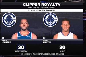 小卡连续30场20+追平格里芬并列队史第6!84-85赛季后队史最长
