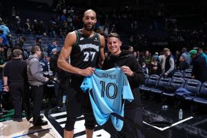 足篮联动!J罗观战森林狼比赛,与戈贝尔寒暄互动