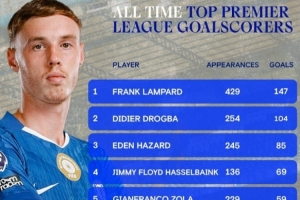 帕尔默为切尔西在英超打进43球,超越特里独占队史第8位