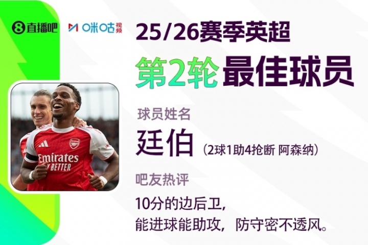 直播吧X咪咕体育|英超第2轮最佳:廷伯2球1助4抢断当选