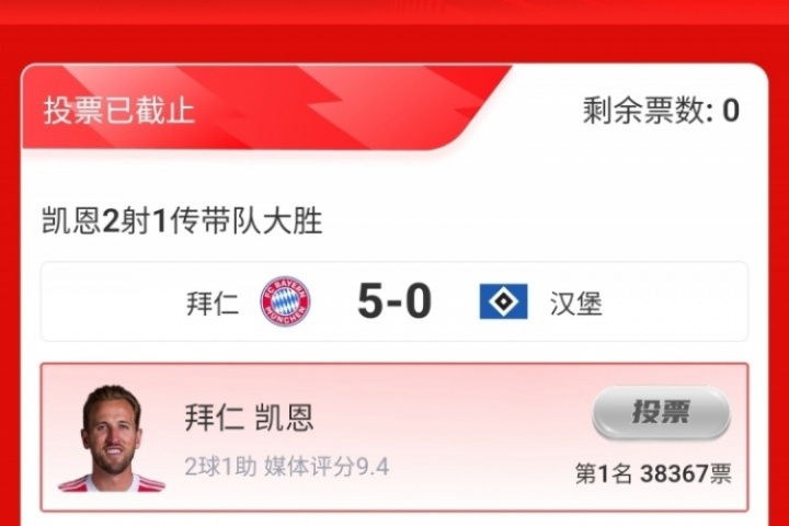 第三轮评选结果结出炉,凯恩2射1传,帮助拜仁5-0大胜汉堡,获得吧友近4万票的支持,击败格里马尔多当选 【体育资讯X小红书德甲第3轮最佳球员】!